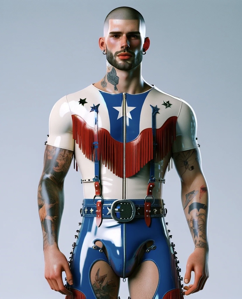 Appelt, known for his groundbreaking and innovative designs in the fashion and fetish realms, will bring his unique aesthetic to the world of country. The image showcasing his latest designs combines classic rodeo elements with modern, avant-garde details. From fringes and stars to a striking color palette of red, white, and blue, his outfits reflect a dynamic fusion of tradition and modernity.