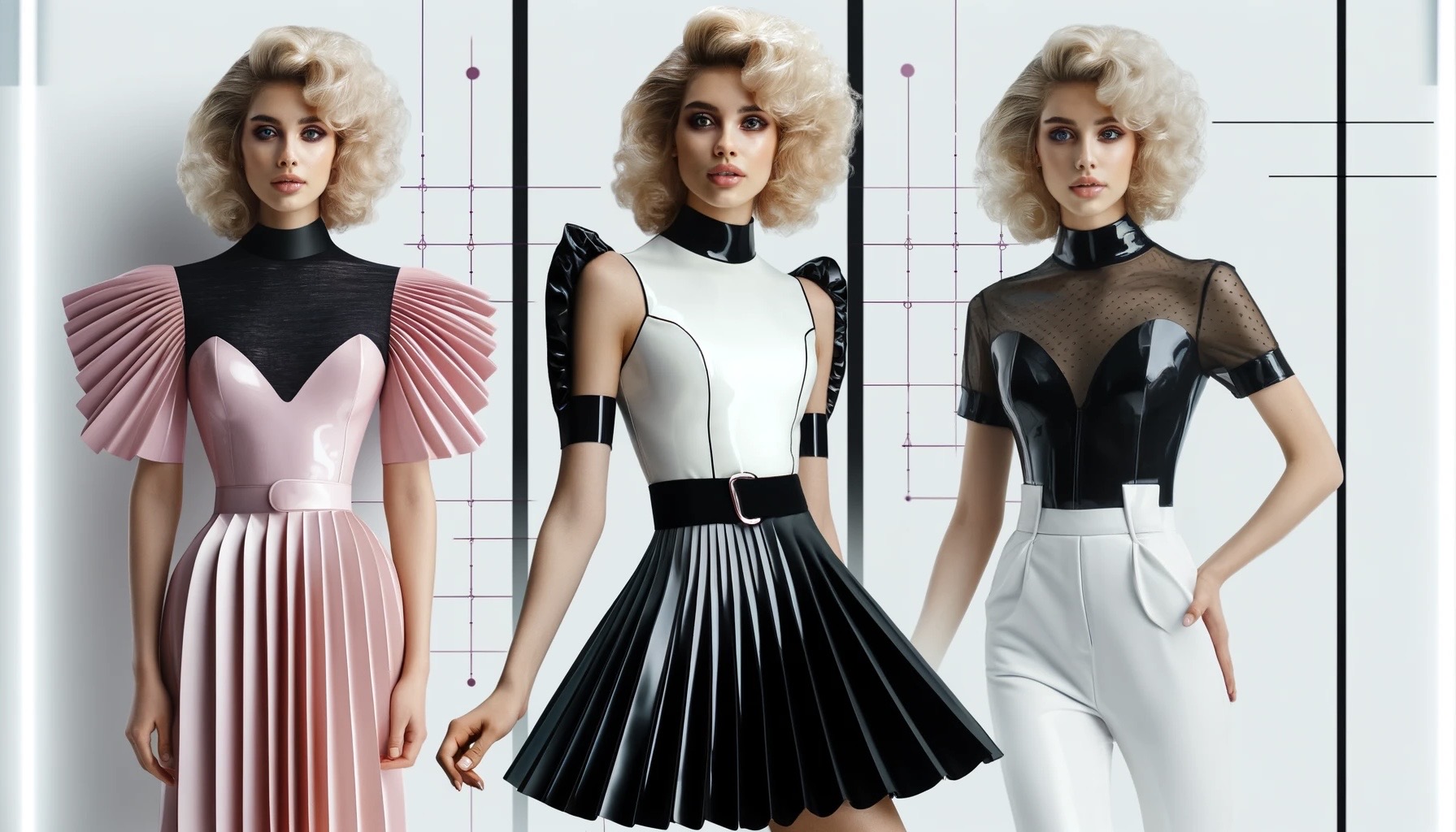 The image of his latest collection showcases striking latex dresses that captivate with their structured shapes and vibrant colors. From red to pink to metallic tones, each piece is a work of art in its own right. Particularly noteworthy are the intricately designed pleated skirts that reinterpret the classic silhouette with a futuristic touch.