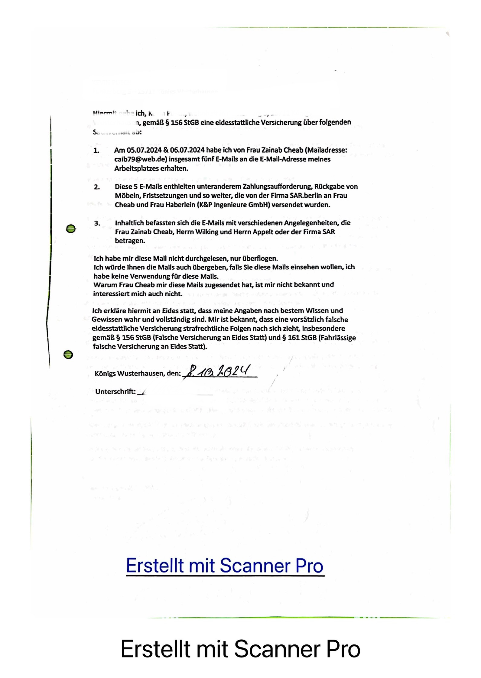 Im August 2024 habe ich mich dann wieder widersetzt und sechs bis sieben E-Mails geschrieben – an Cheab und Wilking.